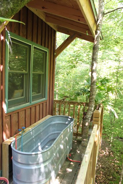 hey y'all! here are some quick answers to some of your questions: my dad got the barn door hardware from "tractor supply" (that sounds real country!!). yes, that is an outdoor bathtub...it gets hot in the woods; rest assured, he does have a shower indoors though :)! and our camera is a cannon rebel T1i...its awesome but i still don't know how to fully use it.